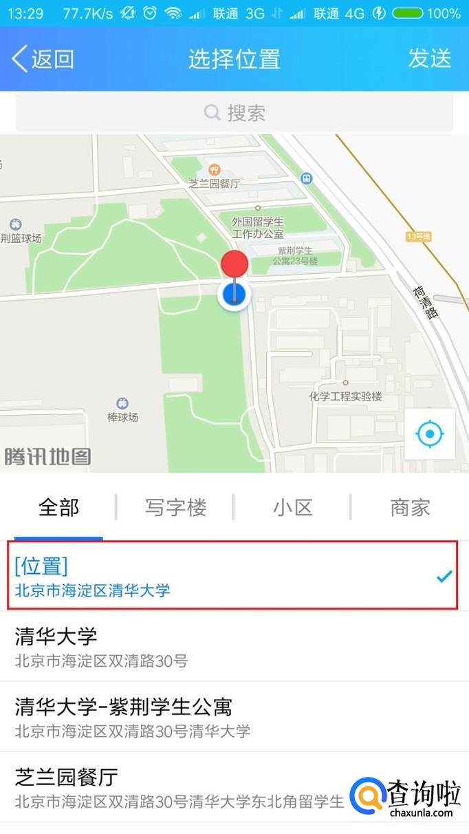 然后即可看到手机QQ默认当前显示的位置信息即为我们刚才模拟显示的位置信息,到此,位置信息已经被模拟成功了。
