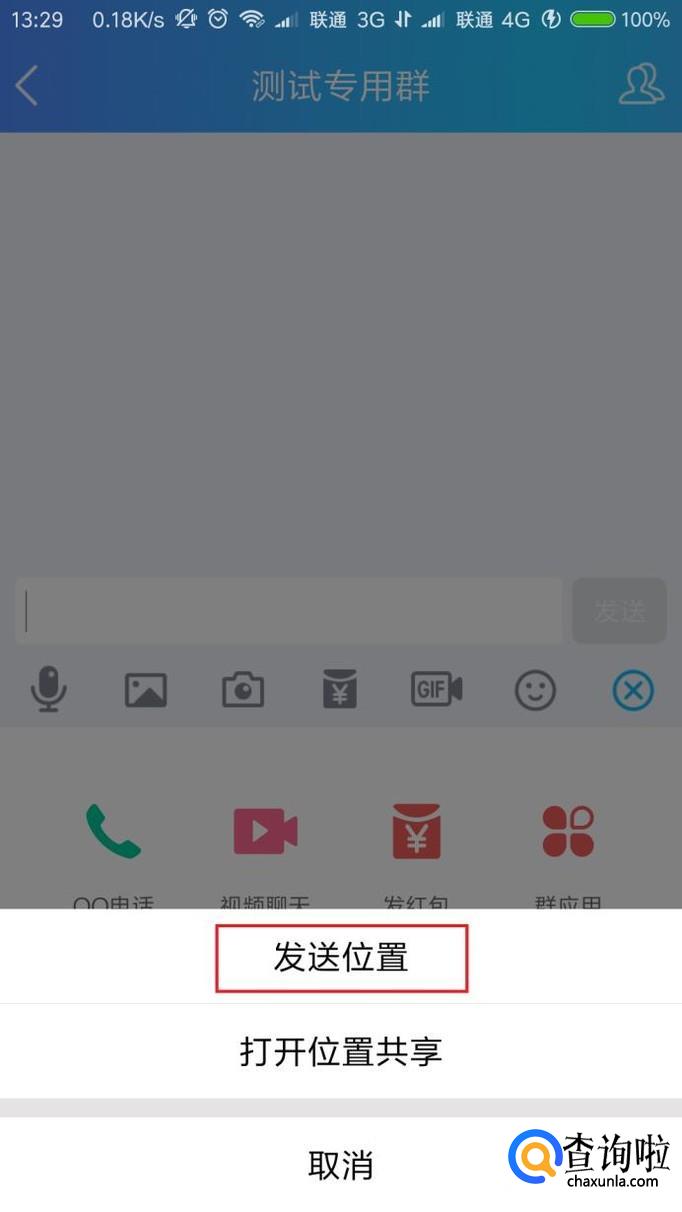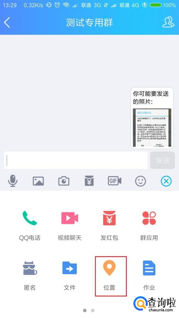 接下来,我们可以测试一下位置信息是否被模拟成功,打开手机QQ聊天对话窗口,点击“位置”按钮功能。