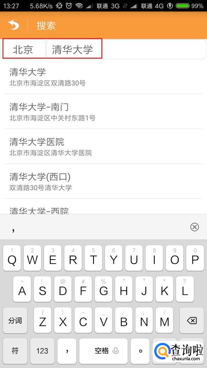 在打开的搜索页面中,输入自己想要模拟的位置信息,这里我输入的是北京市清华大学。
