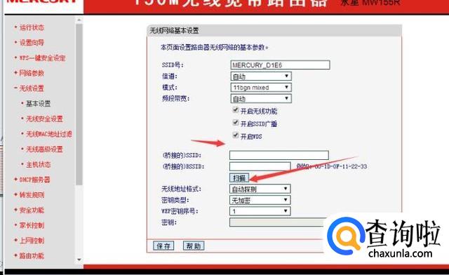 在无线设置界面,可以看到右侧有一个信道的选择项。先不要去选择。在下面的WDS选项打勾。就会出现WDS选项,点击下面的扫描。