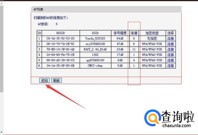 接着路由器会自动扫描周边的路由器,在出现的路由器界面可以看到大家正在使用的信道。找一个大家没有使用的信道或者使用比较少的信道。查看好之后点击左下角的返回
