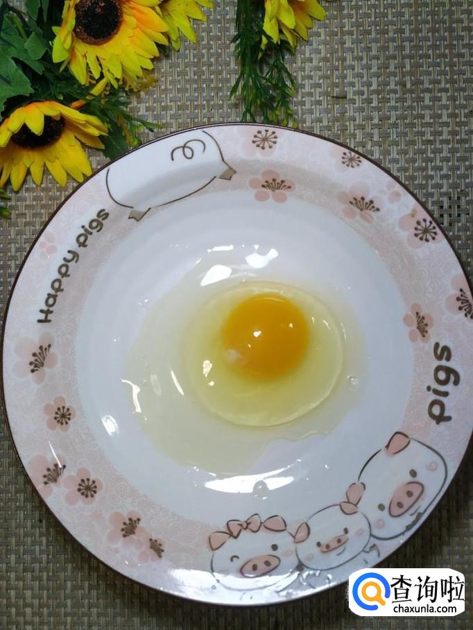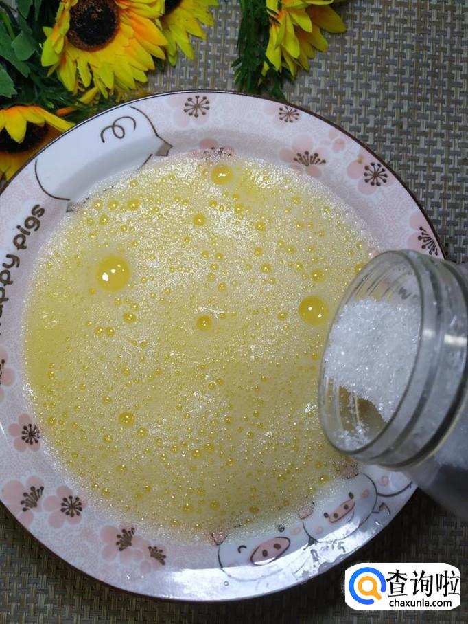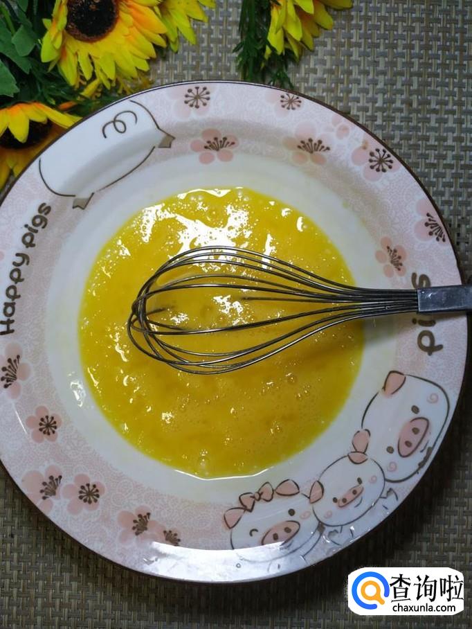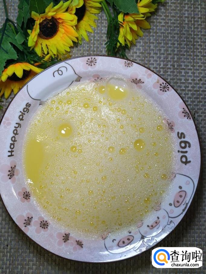碗中打入一个鸡蛋,用打蛋器打散,尽量打出泡沫来。