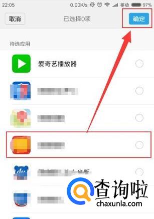 进入之后,选择想要隐藏的应用,然后点击右上角的“确定”即可隐藏应用图标,如图所示。