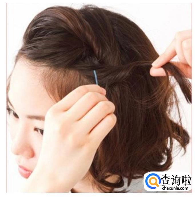 再在固定刘海的一侧旁边选一小束发束,稍微的扭一扭之后放在前面的发束上面,用夹子固定。
