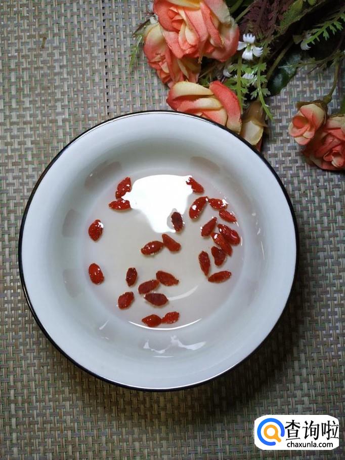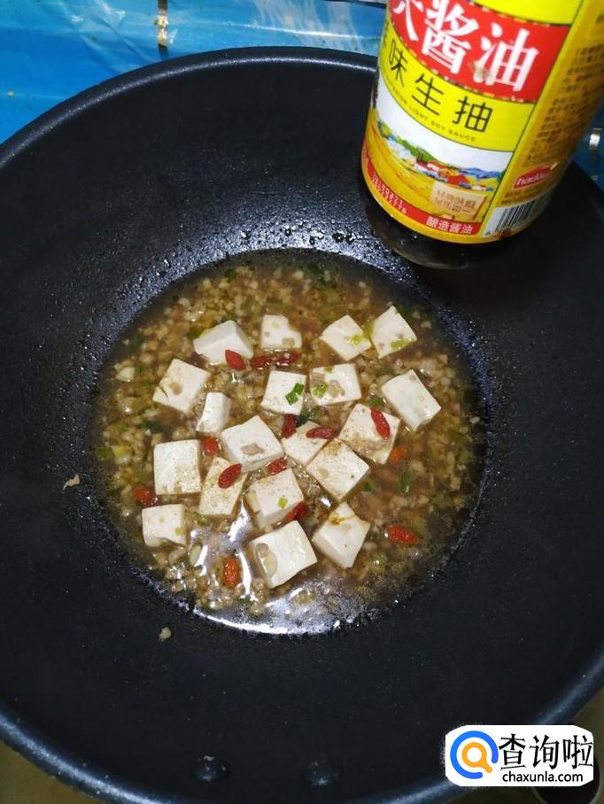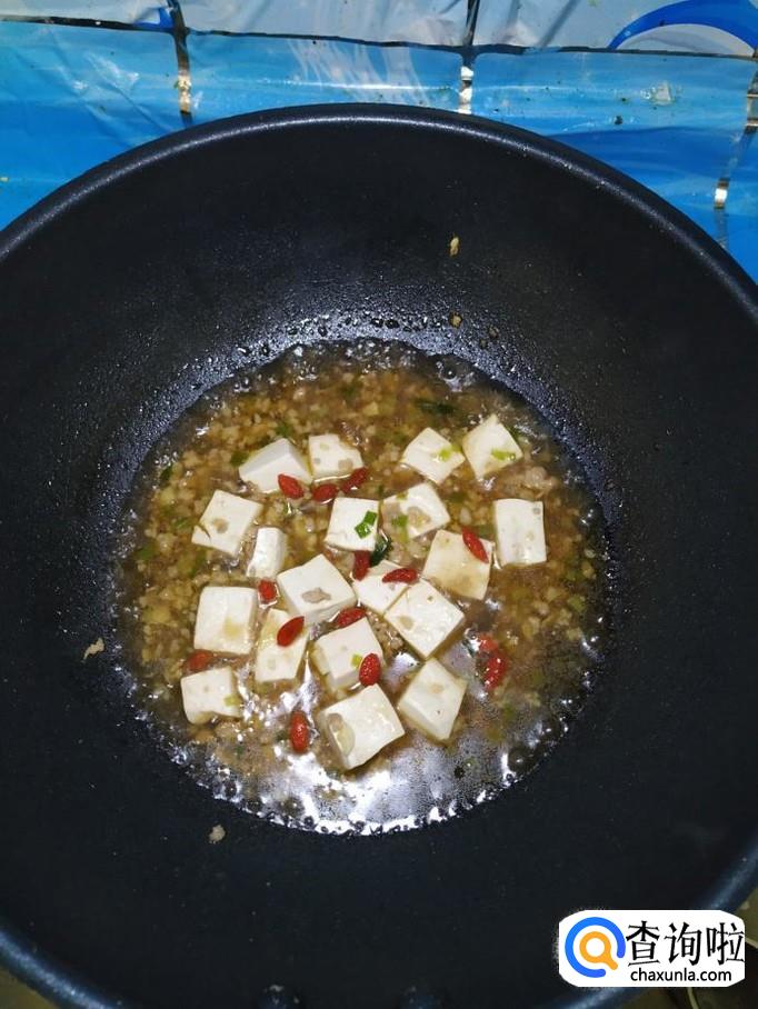 准备适量枸杞子,用清水泡一下,倒入锅中和豆腐一起炖五分钟左右。