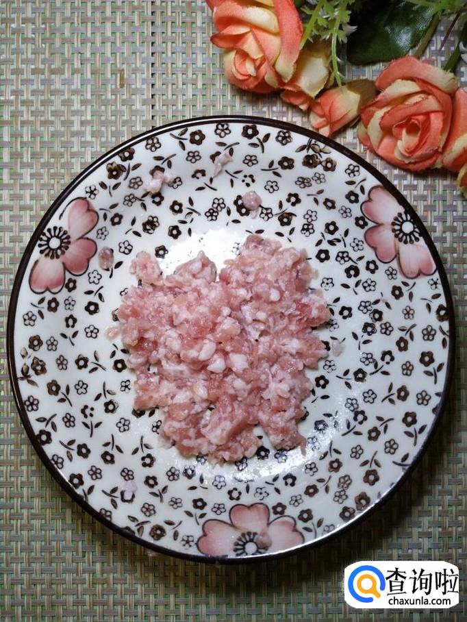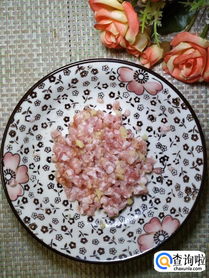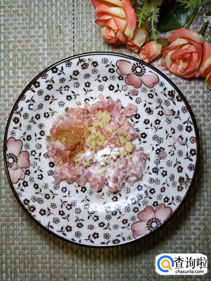 准备吃点五花肉,剁成肉末,再准备适量生姜,洗净后切碎放在上面,放入适量盐,鸡精,五香粉,料酒,腌制20分钟左右。