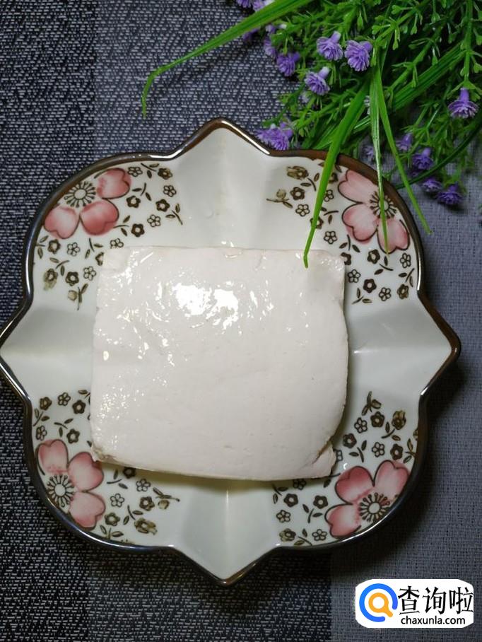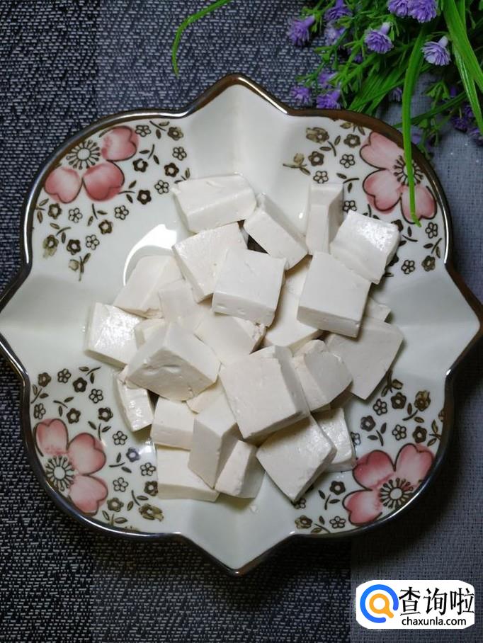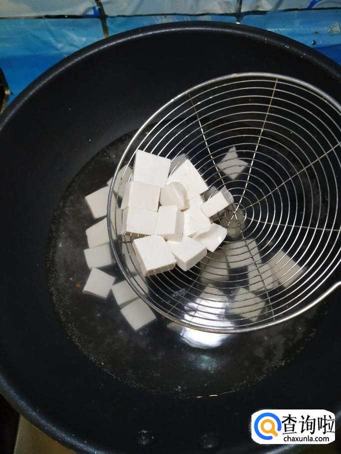 准备适量嫩豆腐,洗净后切成块。锅中烧开水,水开后,将豆腐放入锅中焯水,焯好之后,捞出备用。