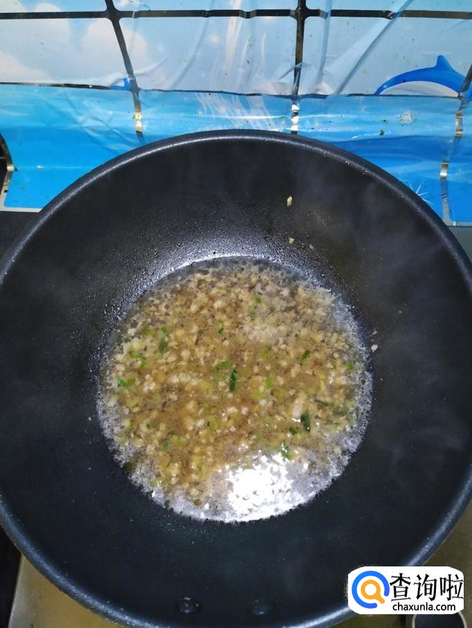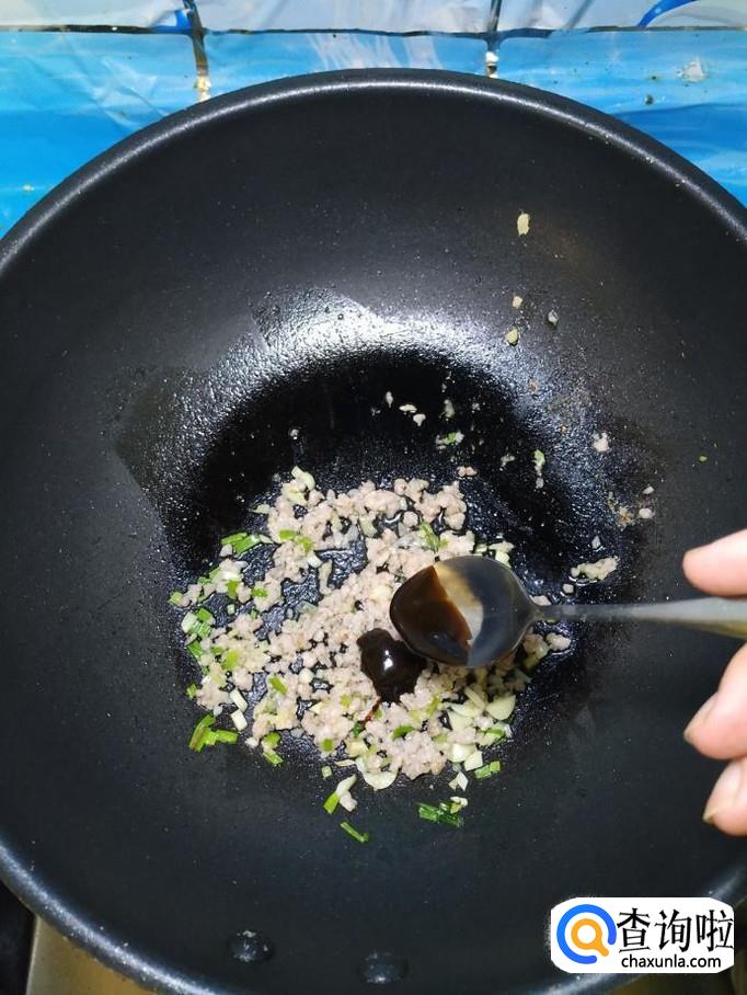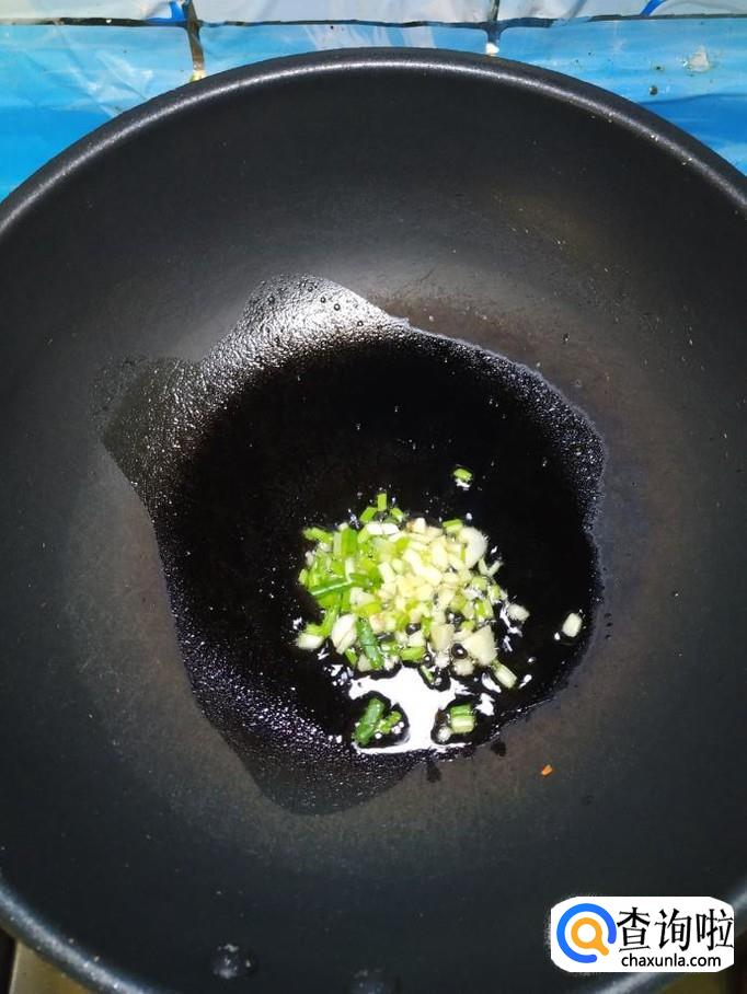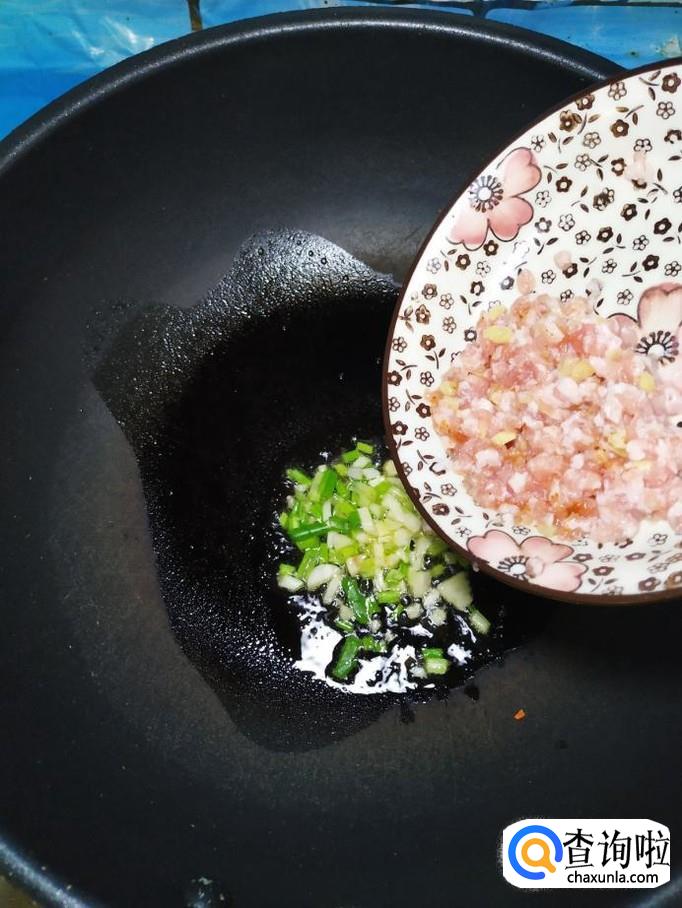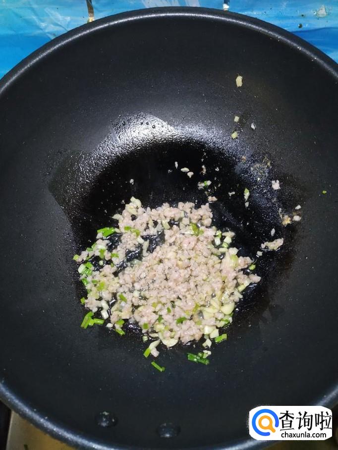 准备适量大蒜和小葱,洗净后切碎,炒锅中放入适量油,油热后将蒜末和葱末放入锅中炒香,然后将肉末倒入锅中炒一下。