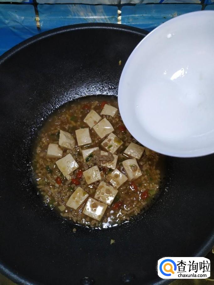 准备适量淀粉,再加入清水,做成水淀粉,将水淀粉倒入锅中,熬至汤汁浓稠。