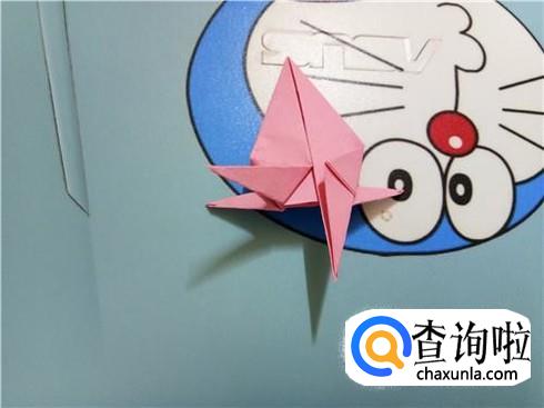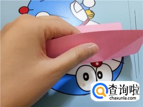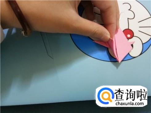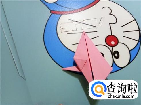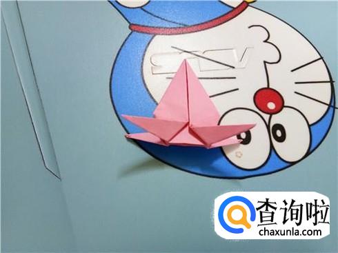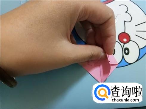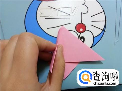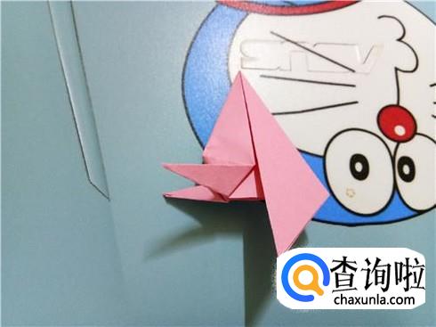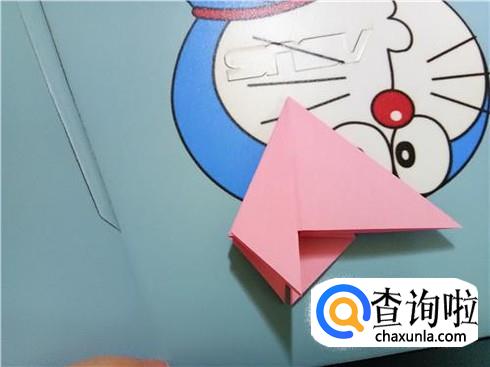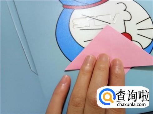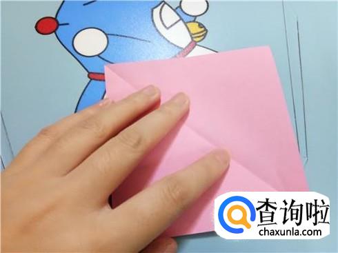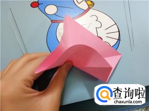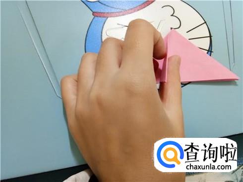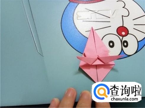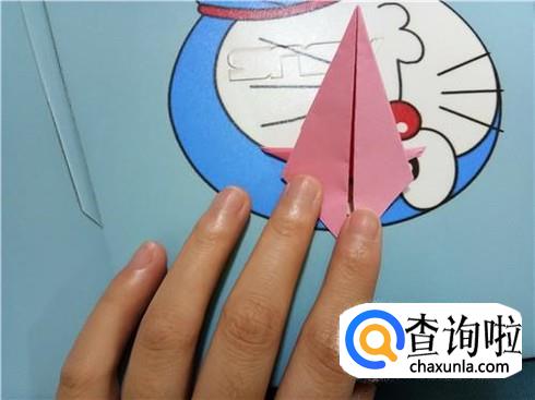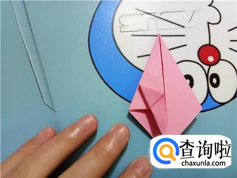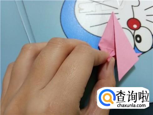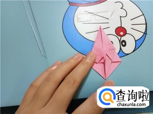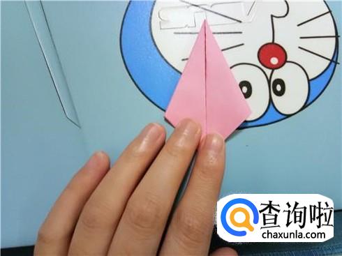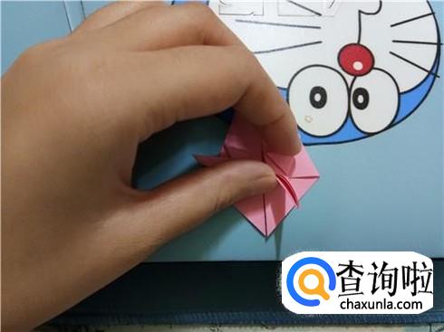 紧接着,我们将左右两边的角折叠回来与中轴线重合,再将下边形成的细长的部分沿着折叠回来的部分向外折叠。