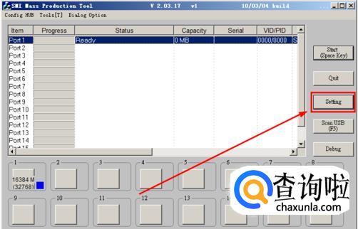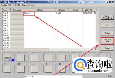 在慧荣量产工具中,我们点击 scan usb,进行U盘扫描,在状态中出现“ready"表明量产工具能正常读取U盘。