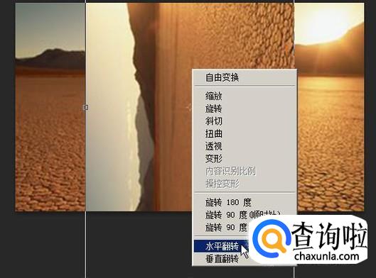 “图片副本”这层在选中的状态下,按下CTRL+T,调出定界框,把图片旋转-90度。鼠标再右击图片,弹出菜单中选择:水平翻转