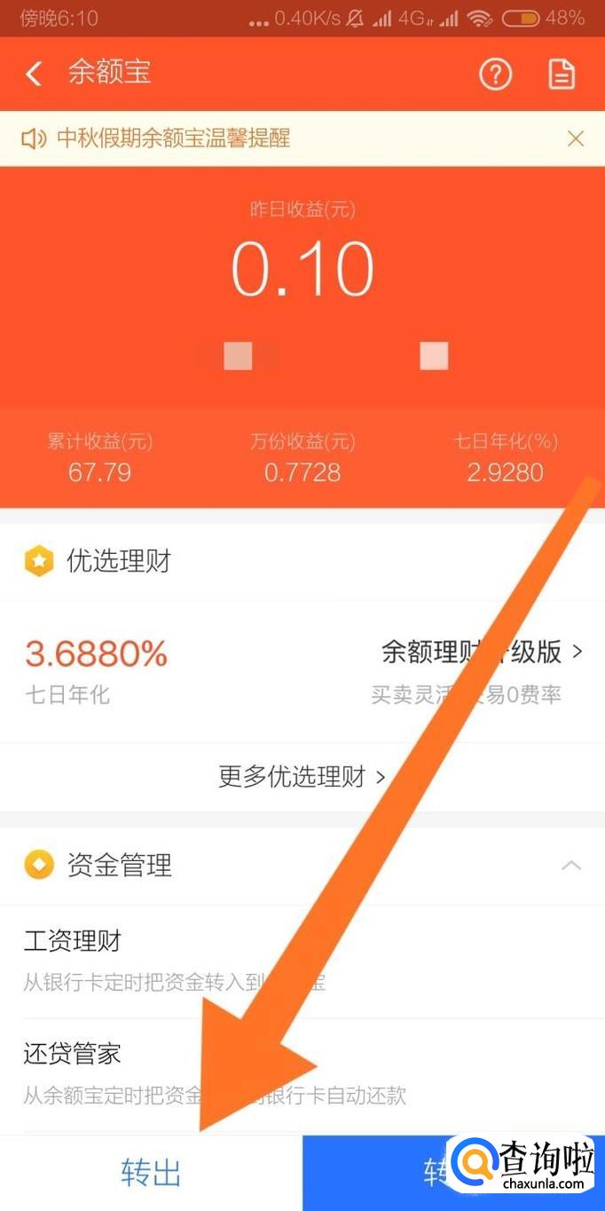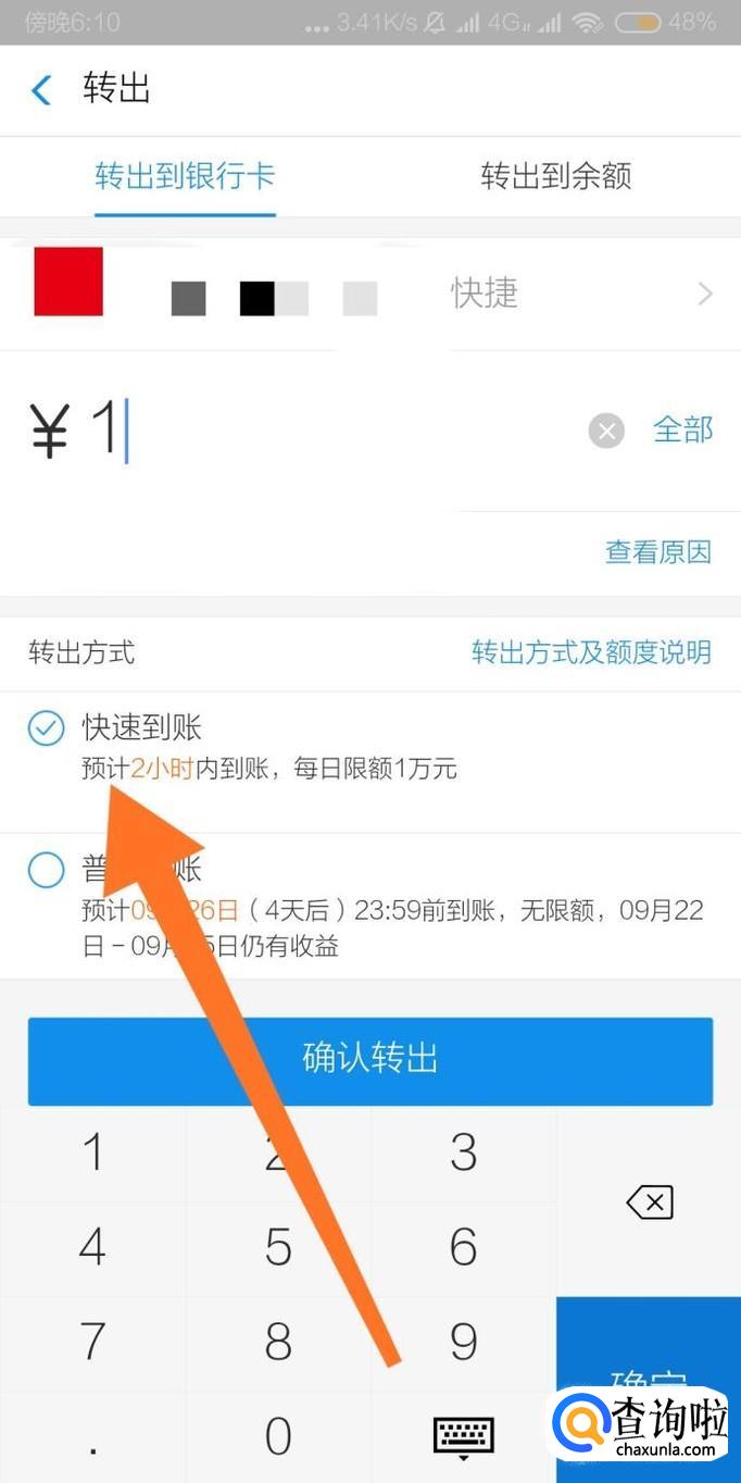 输入提现金额后,最后在转账方式勾选“快速到账”即可把余额宝资金快速提现到银行卡。