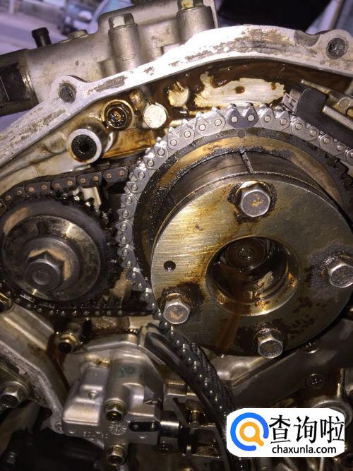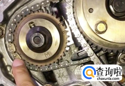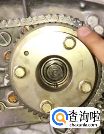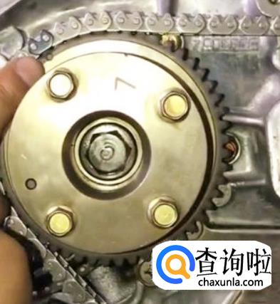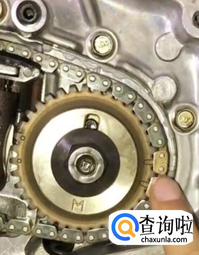相信熟悉的人对凸轮轴链轮上圆点对链条上的有色链接和曲轴链轮凹槽对链条上的有色链接都不是很陌生应该都会。这是大链条。