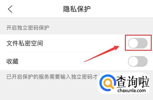 在隐私保护页面上,找到“文件私密空间”,将后面灰色的按钮打开。
