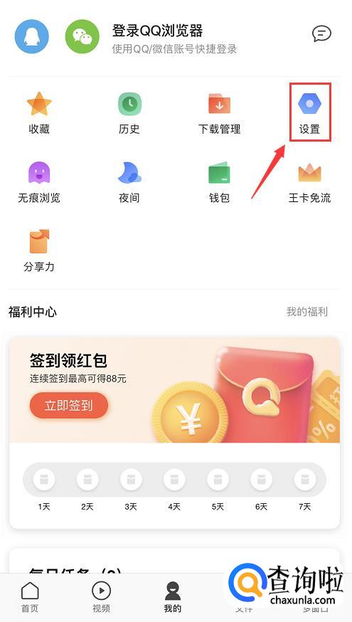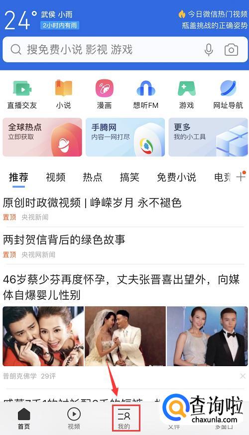进入QQ浏览器主页后,在页面下方有一排功能按钮,点击中间【我的】。