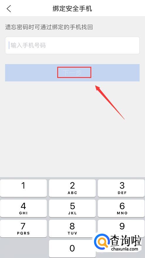点击按钮后,会跳转到绑定安全手机页面,输入你的手机号码,点击【下一步】。这一步操作是为了遗忘密码的时候可以通过绑定的手机找回。完成后,QQ浏览器的私密空间就被开启了。