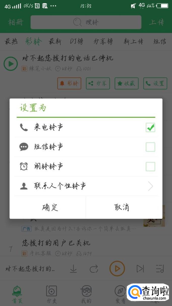 找到自己想要的彩铃后,点击后方的“设置”选项,如图1箭头所示。会弹出来一个新的界面,如图2所示。设置为来电铃声,确认就可以了。