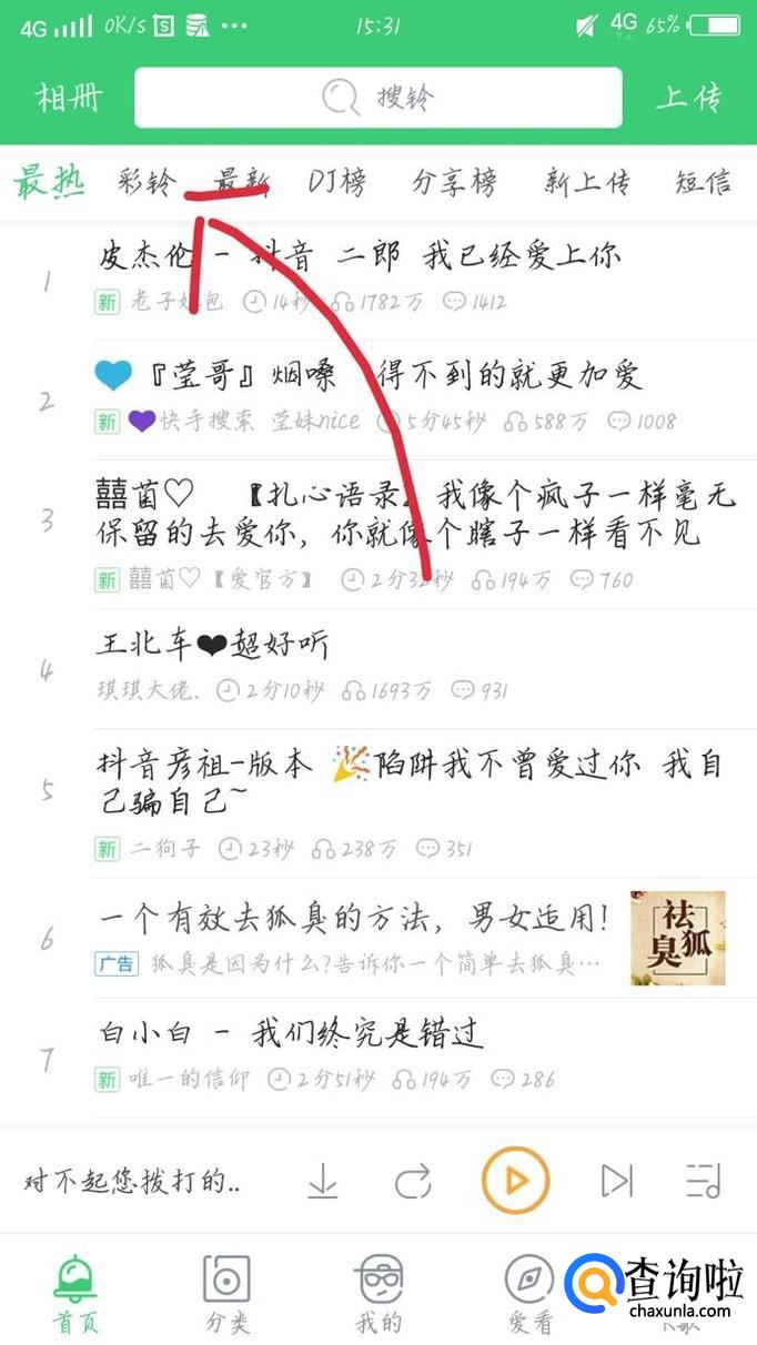 点击搜索框下方那一栏, 从左往右数第二个“彩铃”选项,如图1箭头所示。