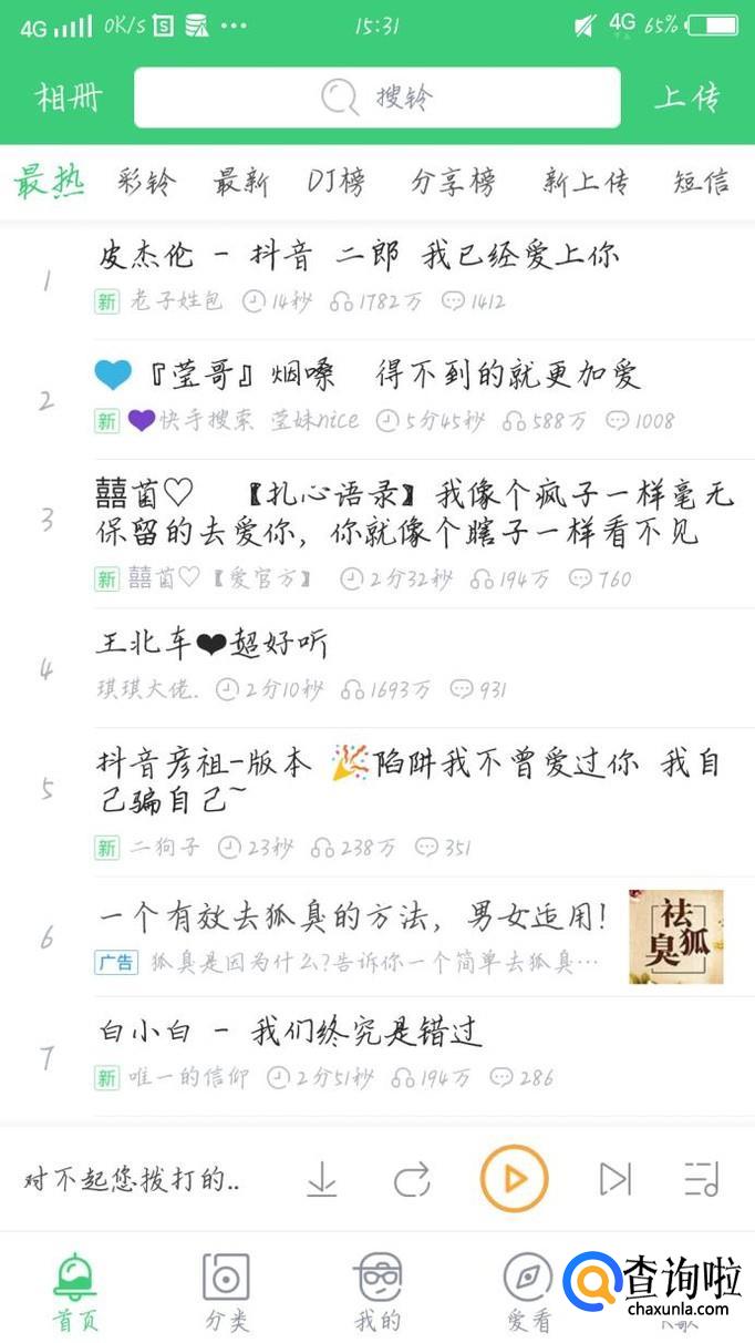 会进入一个新的界面,如图1所示。在这里你可以看到彩铃的热度排行榜,可以听一听找到自己喜欢的。
