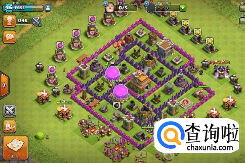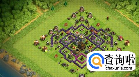 这个阵型是个回形变种阵,大本和资源都放到了内部,同时大本周围加上两层城墙,同时在科技周围布置陷阱,想要推到中间也不容易。