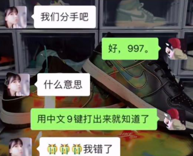 另外,997这个梗也有其他意思,是一个关于恋爱的数字,用拼音9键按下997,查看打出的文字内容是什么,因为每个人的输入法习惯不同,打出的内容也不同,所以具体含义也不同。有的用户打出的是“我也是”、“在一起”、“走下去”等等,所以说“997”也可以在任何适合使用,无论是告白还是分手都适合。