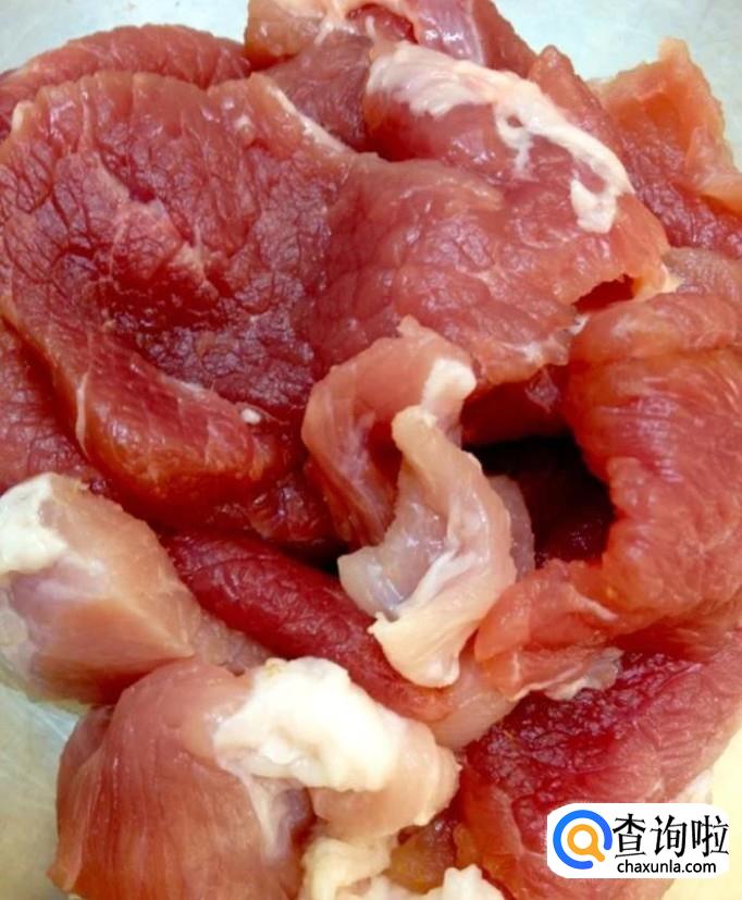 首先将猪肉切成片,在肉片上面戳几个洞。