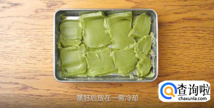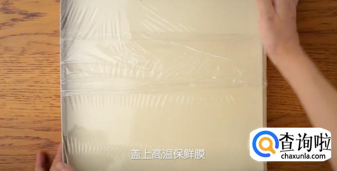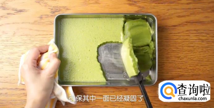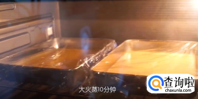 到时间后取出,不要搅拌,用刮刀进行翻面,确保其中的一面已经凝固了,如果没有就继续蒸到凝固再翻面。接着盖上保鲜膜继续蒸10分钟,蒸好之后放在一旁冷却。