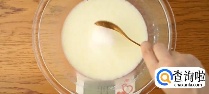 加入90g绵白糖,继续混合。再加入70g糯米粉、55g粘米粉、30g澄粉,一起混合搅拌均匀,放在一旁静置5分钟。