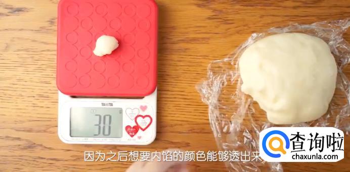 等冰皮完全冷却之后,把它分成10g每份,因为之后想要内陷的颜色能够透出来,所以皮用得比较少。