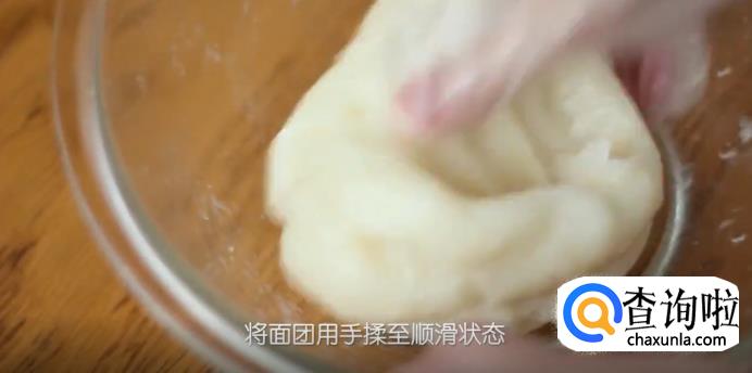 待时间到之后,倒入大的浅盘中,盖上高温保鲜膜,开大火蒸20分钟。蒸好后取出,放置到不烫手的状态,戴上手套,将面团用手揉至顺滑状态。