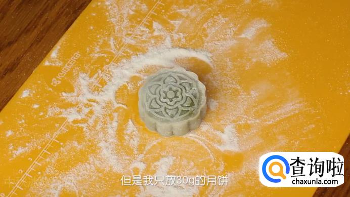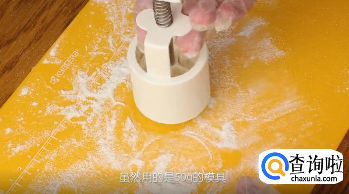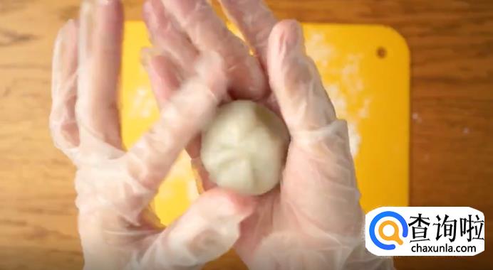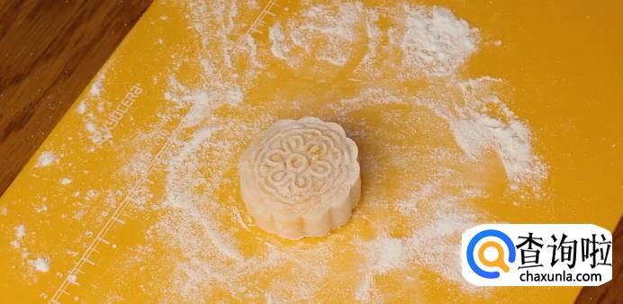 在粘板上撒些糕粉备用,将冰皮搓成球之后再用手压平,然后包入内陷,封口捏紧,全身裹上一层糕粉,封口处朝下,用模具压出形状即可。