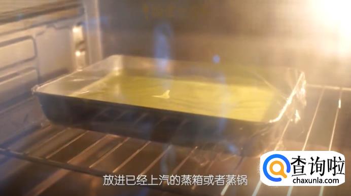 把混合好的馅料倒入一个浅盘里,因为太厚的话不容易凝固成型。然后再盖上高温保鲜膜,放进已经上汽的蒸箱或者蒸锅,开大火蒸10分钟。