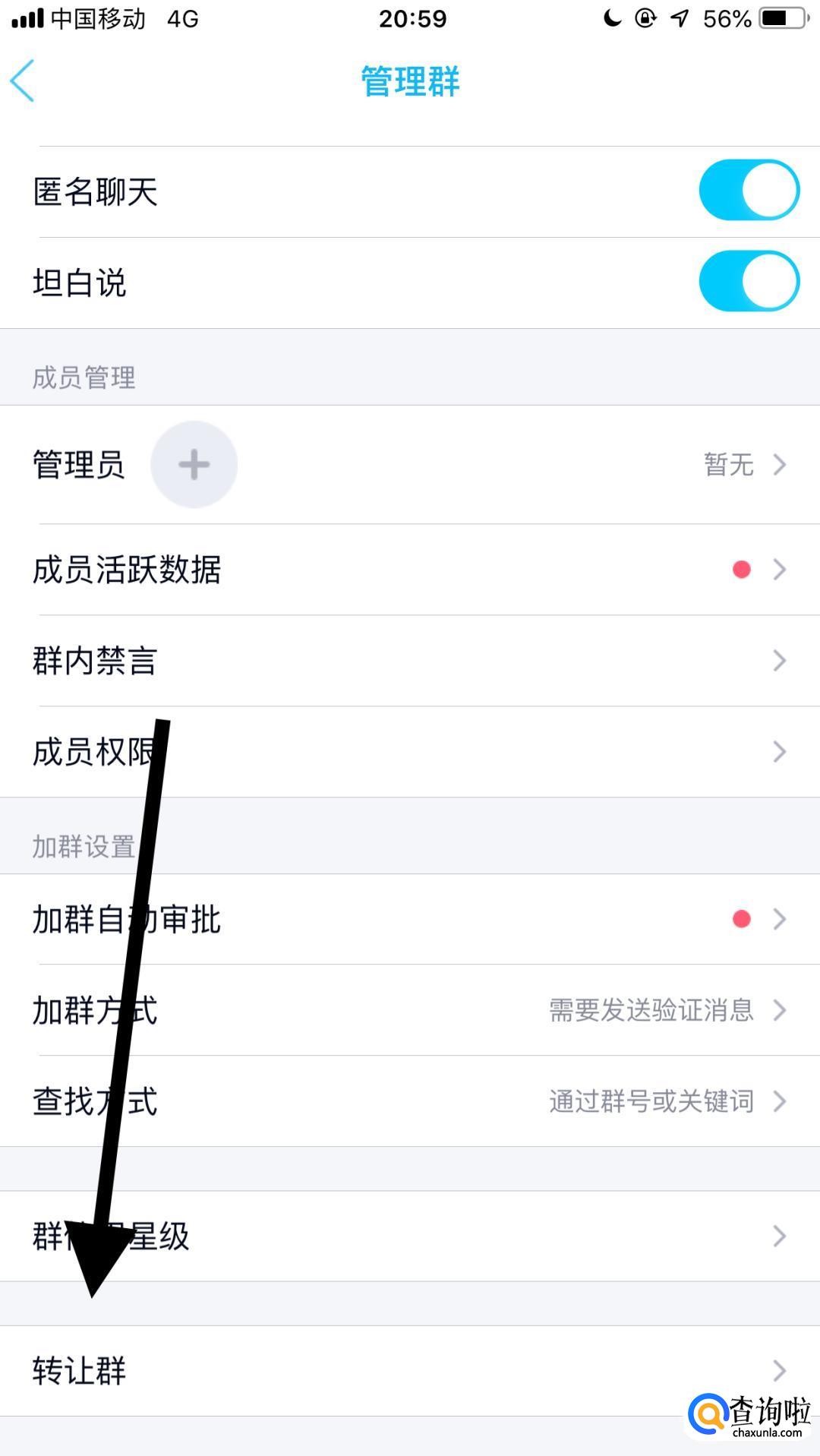 然后点击转让群。