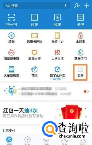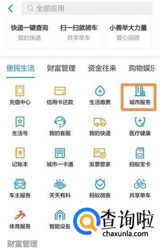 打开手机支付宝,在首页点击“更多”,进去之后点击便民生活中的“城市服务”。