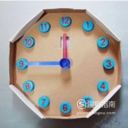 找到废弃的纸盒,然后把纸盒折成八边形的钟表盘,接着在瓶盖上写上数字,放置于钟表盘的每个角落,可以提高孩子的动手能力哦。