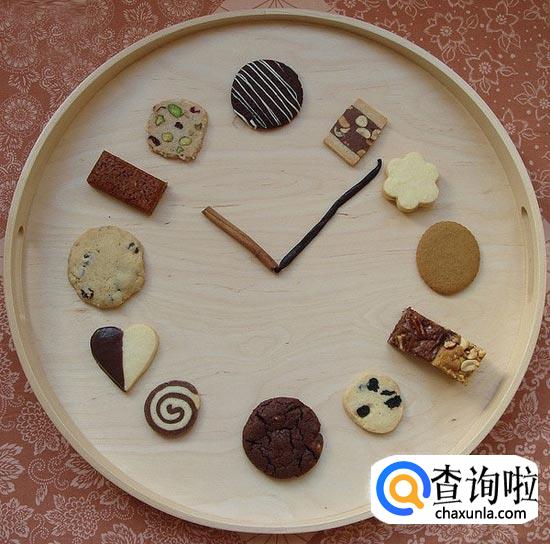 拿出一个圆形的木盖,里面放上孩子喜欢的12种不同形状的饼干,用棍型的饼干当指针,简直就是美食的诱惑啊。