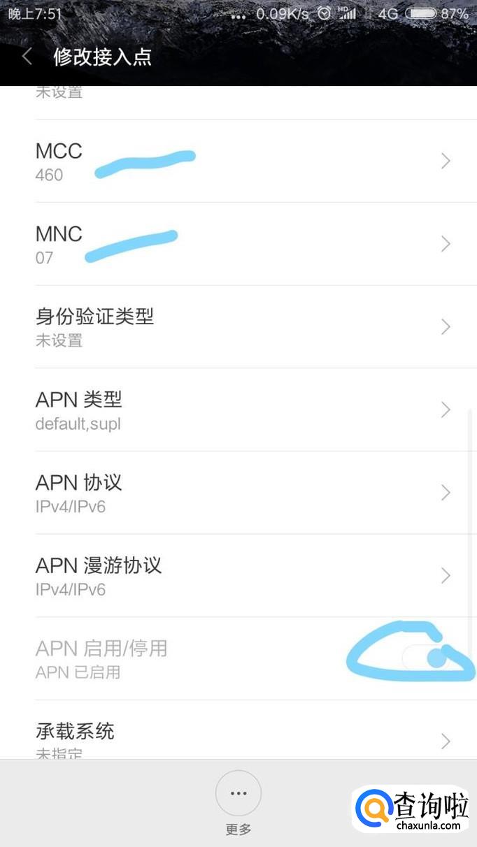 进入修改接入点的界面,找到MCC和MNC,设置如下图的参数,启用APN,这样即可实现快速的上网了