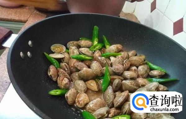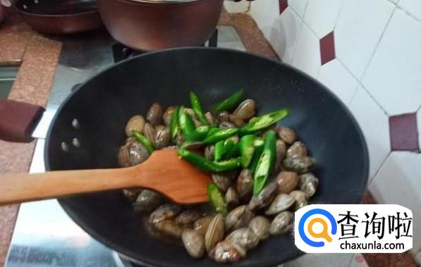 倒入辣椒,不断翻炒,让花甲能浸透辣椒的味道。