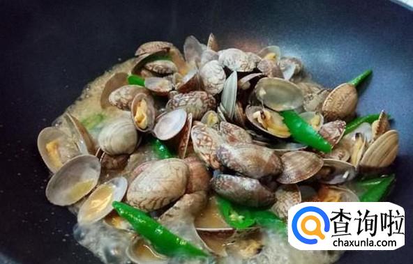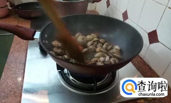 加入少量的清水,盖上锅盖焖一会,让每一个花甲都能裂开。 然后再翻炒花甲,让花甲肉更加入味。