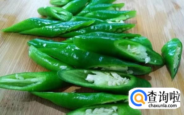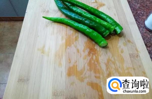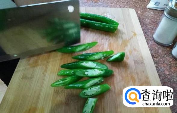 长辣椒清洗干净,切掉头部,然后切成滚刀状。 不需要把辣椒籽给弄掉哦,有辣椒籽才会有辣味,花甲才更好吃一些。