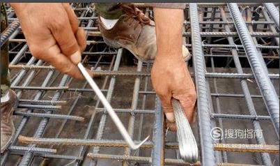 先介绍绑法,一手拿着扎钩,另一只手将扎丝对折,从钢筋斜对角穿出。