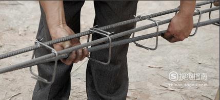 横的钢筋,将最上边的距离用石笔画好,然后将上面的钢筋用扎丝绑扎起来,在将下面的钢筋拉到角用扎丝绑扎,然后绑扎其它的。