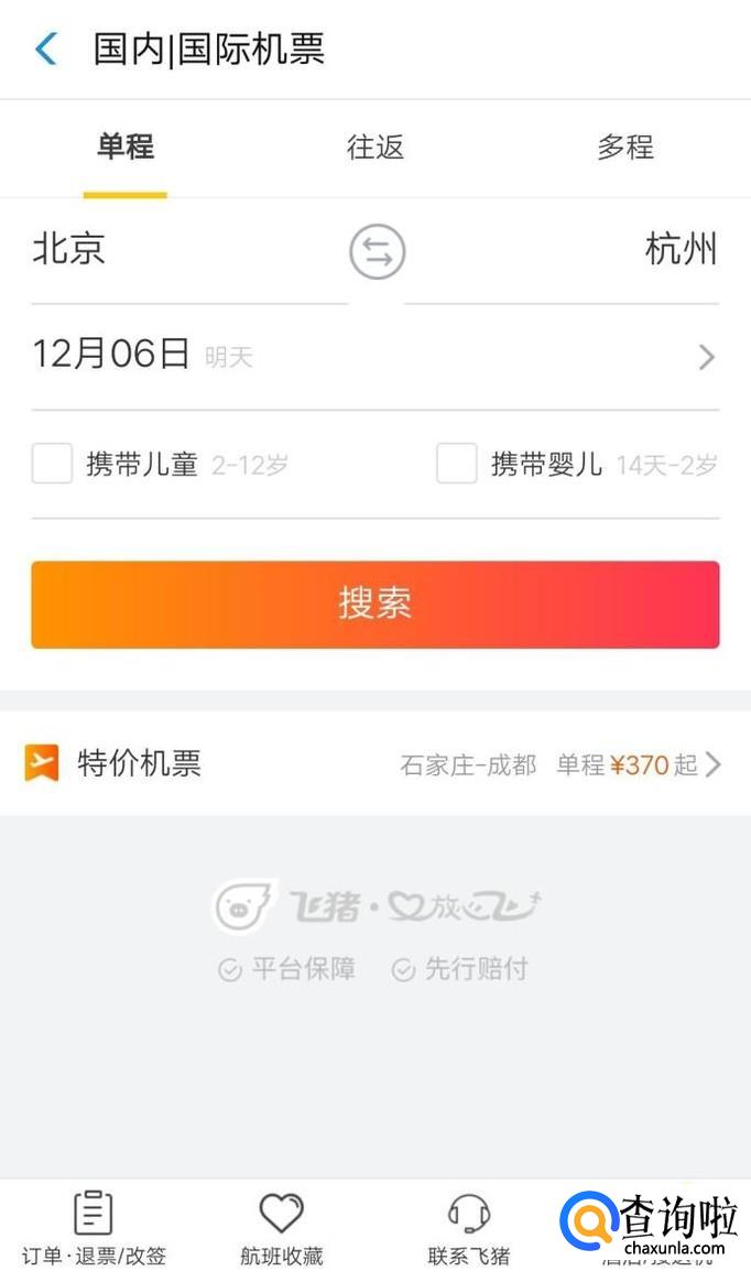 在购买机票界面输入出发地和目的地,点击搜索,如下图。