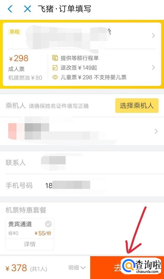 然后选择合适的航班,添加乘坐人信息、联系电话等,点击去购买机票,如下图。
