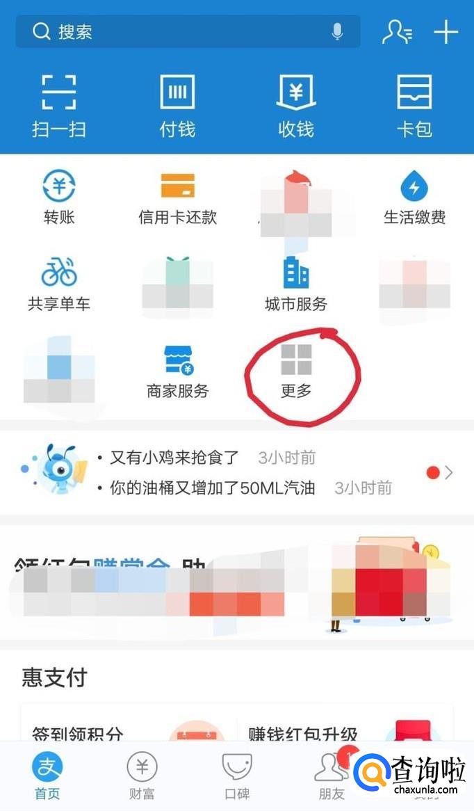 打开手机上的支付宝,点击更多,如下图。