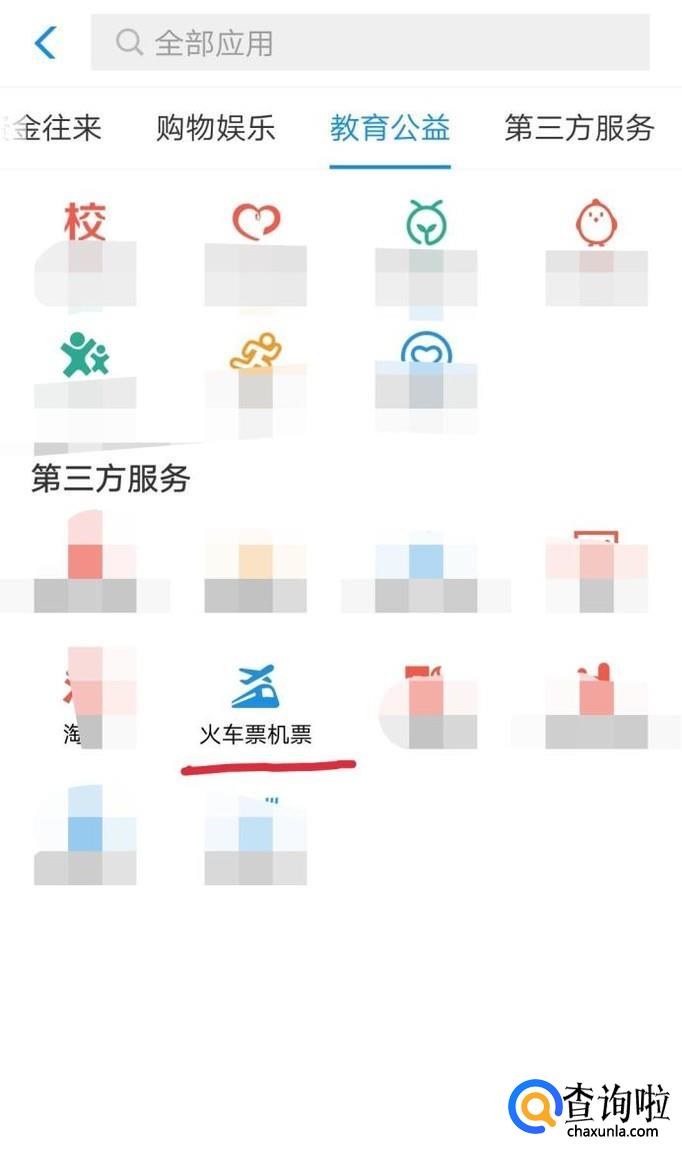 点击第三方服务下的火车票机票,如下图所示。