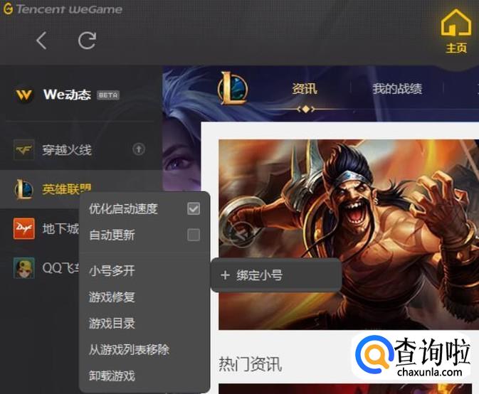 然后登陆wegame的主页后,右键点击游戏,点击绑定小号