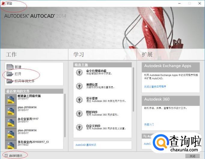 如图所示,弹出"欢迎"对话框。勾选下侧"启动时显示"复选框,点击"工作→打开"图标。