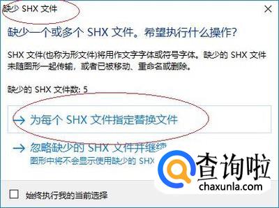如图所示,弹出"缺少SHX文件"对话框。缺少的SHX文件未随图形一起传输,点击"为每个SHX文件指定替换文件"图标。